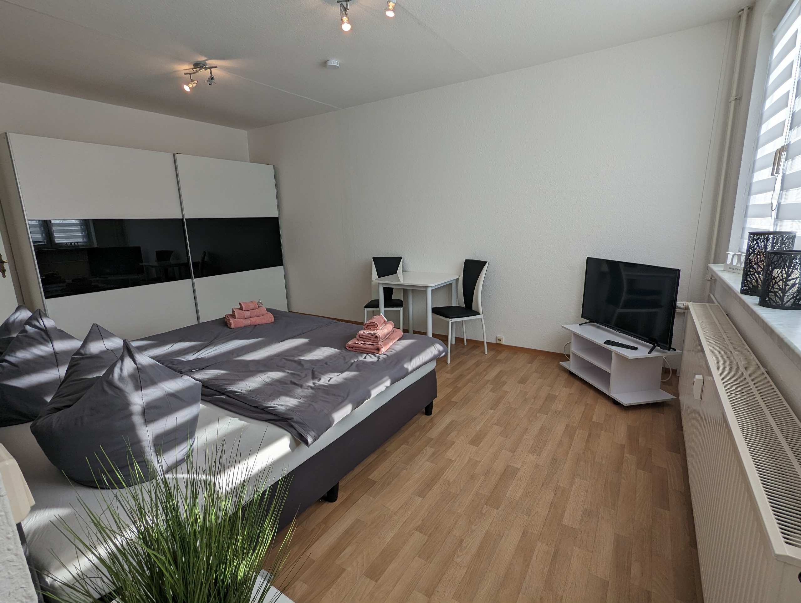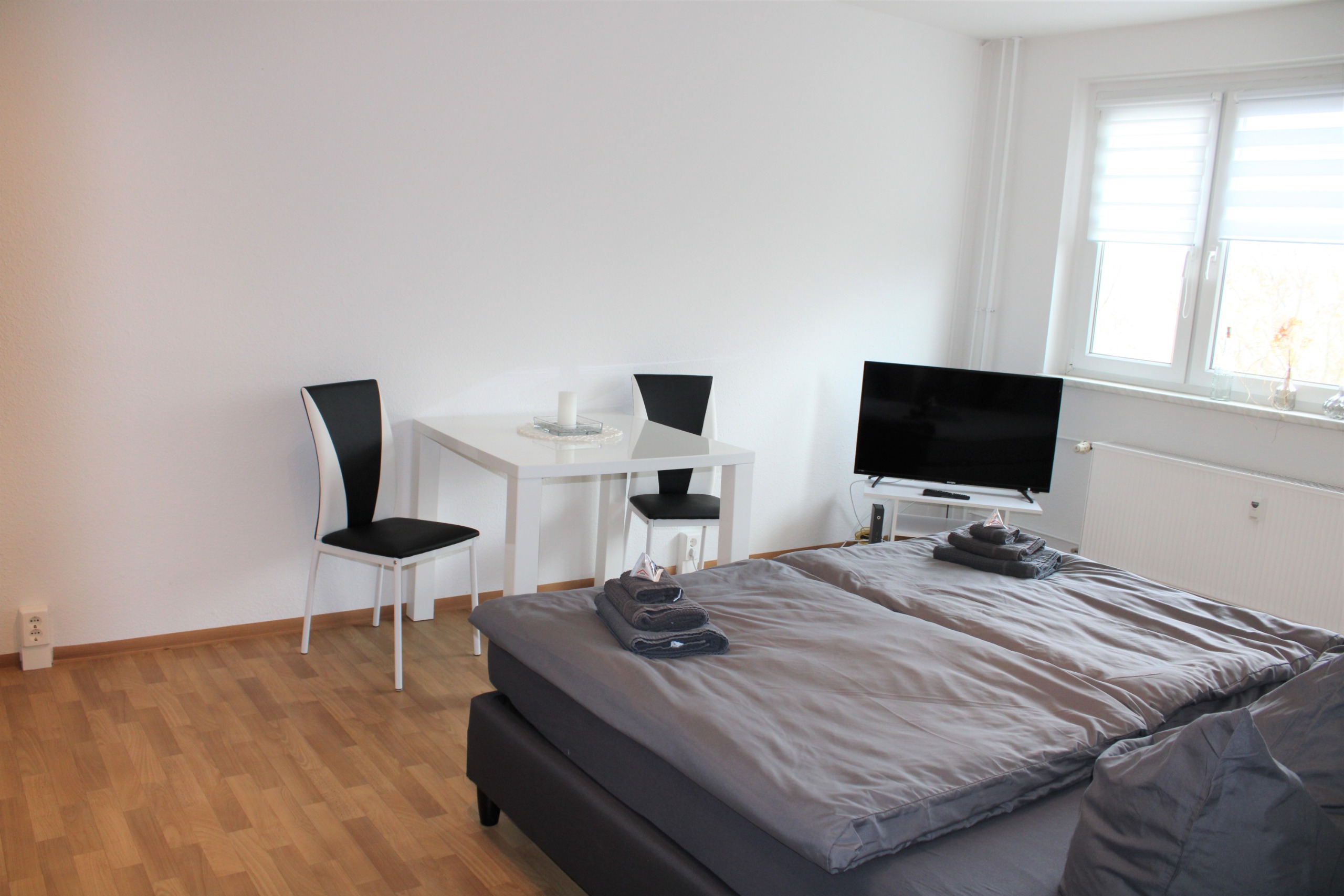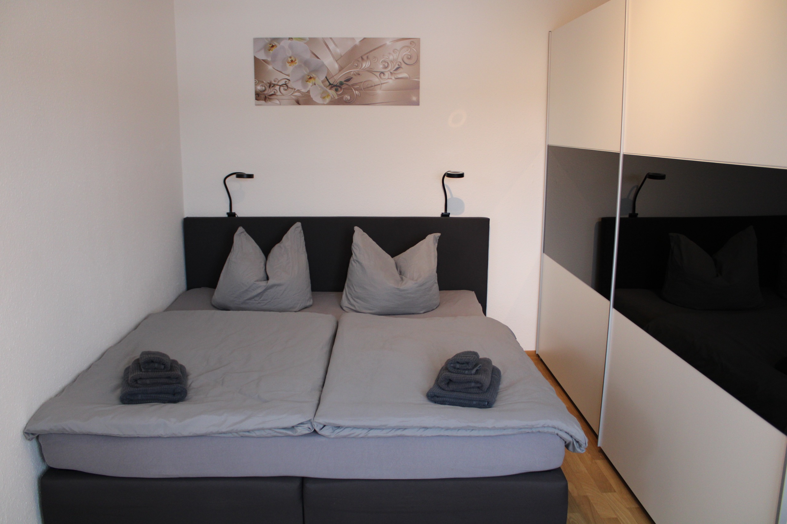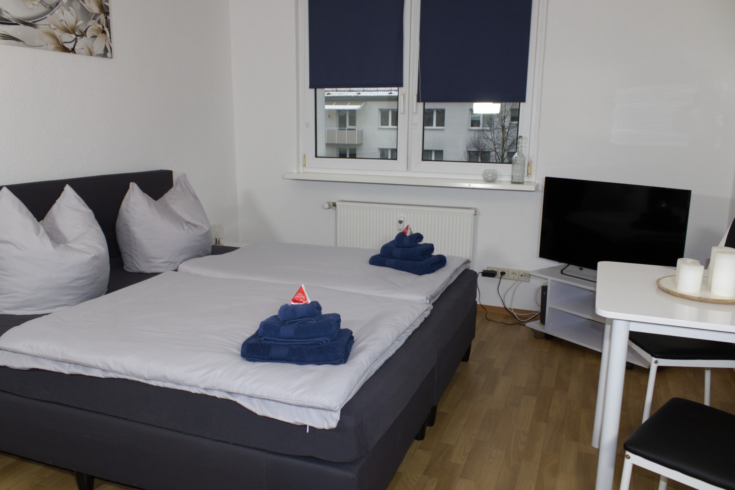 - Bettwäsche und ein Handtuch-Set sind bei Erstbezug der Wohnung inbegriffen. Ein Wechsel des Wäschesets kann für 7,50 € pro Person zugebucht werden.
