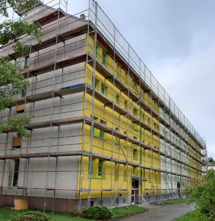 Ab Mitte September 2020 erfolgt sodann die Kompletteinrüstung des Objektes und anschließend die malermäßige Instandsetzung der Fassade inklusive der Umsetzung eines neues Farbkonzeptes.