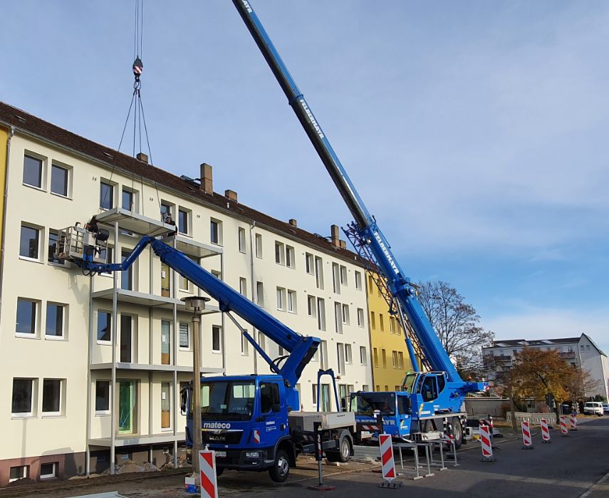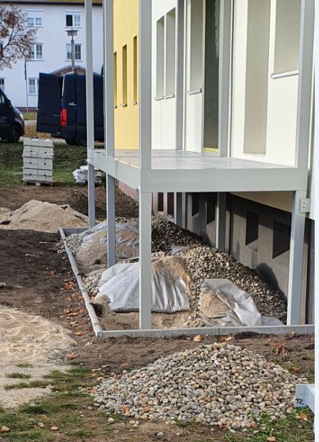 Anfang Oktober werden voraussichtlich die Fundamente für die Balkone gefertigt und eingebaut. Die Balkonanlage wird bis Ende November gestellt. Die Arbeiten an der Außenfassade und an den Balkonen wären damit in diesem Jahr abgeschlossen.